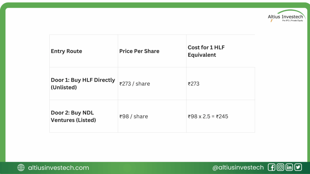 • Implied Fair Value: With NDL trading at ₹98, the implied value of one HLF share is ₹245 (2.5 × ₹98).