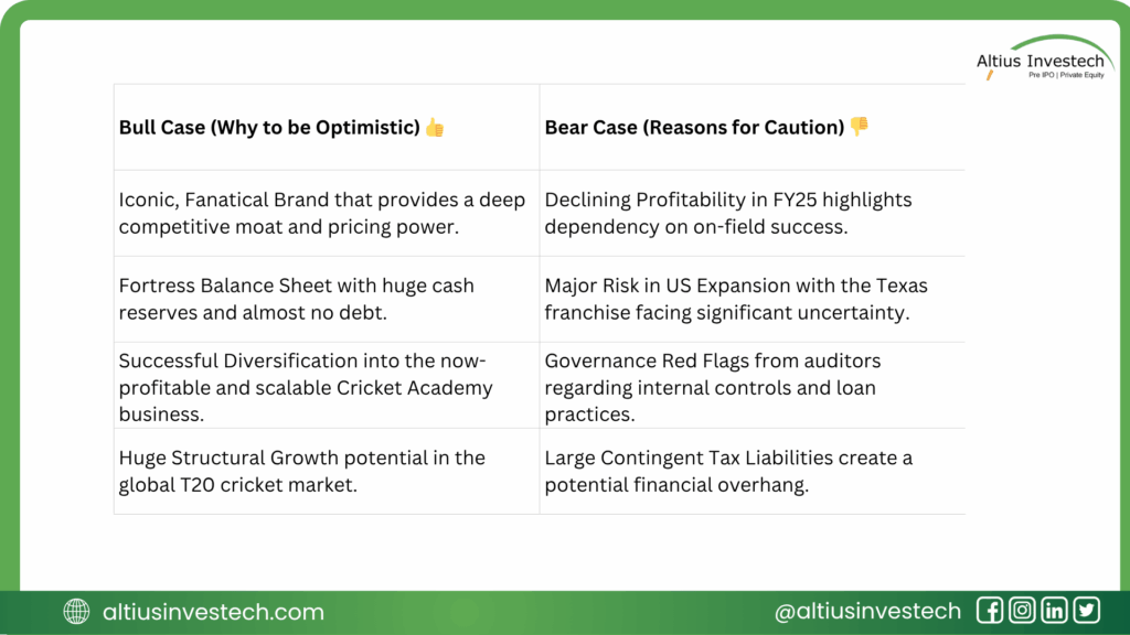 Investing in Chennai Super Kings is a bet on one of India’s most powerful sports brands. While the FY25 financials reflect a temporary dip, the company’s robust balance sheet provides a strong defense. The key variable is execution. If management can navigate the high-stakes risks in its US venture and tighten its governance, the long-term strategy of leveraging its iconic brand into a global entertainment business holds immense potential.