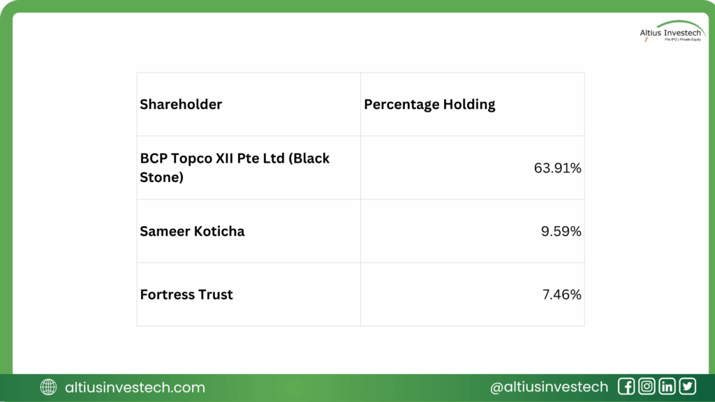 The company has a concentrated ownership structure, with the majority stake held by institutional investor BCP Topco XII Pte Ltd (Blackstone). The promoters, including Sameer Koticha and the Fortress Trust, maintain a significant holding, aligning their interests with the company’s performance.