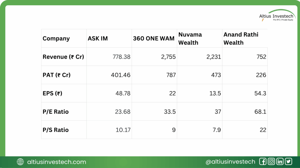 To evaluate ASK IM’s market position, we compare it with its closest listed peers in the wealth and asset management space. The peer group includes 360 ONE WAM, Nuvama Wealth Management, and Anand Rathi Wealth. These companies have similar business models focused on serving High Net-worth Individuals (HNIs) and Ultra-HNIs.