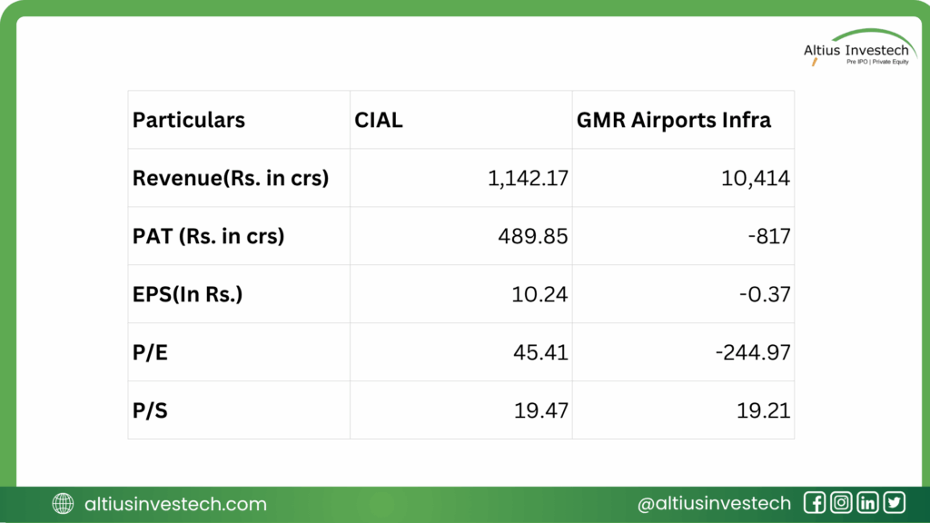 Valuation Story: CIAL’s P/E ratio of 45.41 is based on real, substantial earnings, a key differentiator from its loss-making peer which has no P/E ratio. CIAL’s high P/S ratio of 19.47, compared to GMR’s 0.05, seems justified as the market places a high value on each rupee of its sales, knowing that an industry-leading portion of it converts directly to profit.