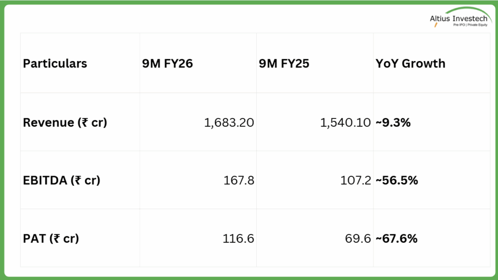 • Exceptional Gain: The 9M FY26 figures were further bolstered by a net exceptional gain of 1.71 Cr,. This consisted of a 2.10 Cr gain from the sale of land at Kalka, partially offset by a 0.39 Cr charge for employee benefit past service costs related to new Labor Codes.
