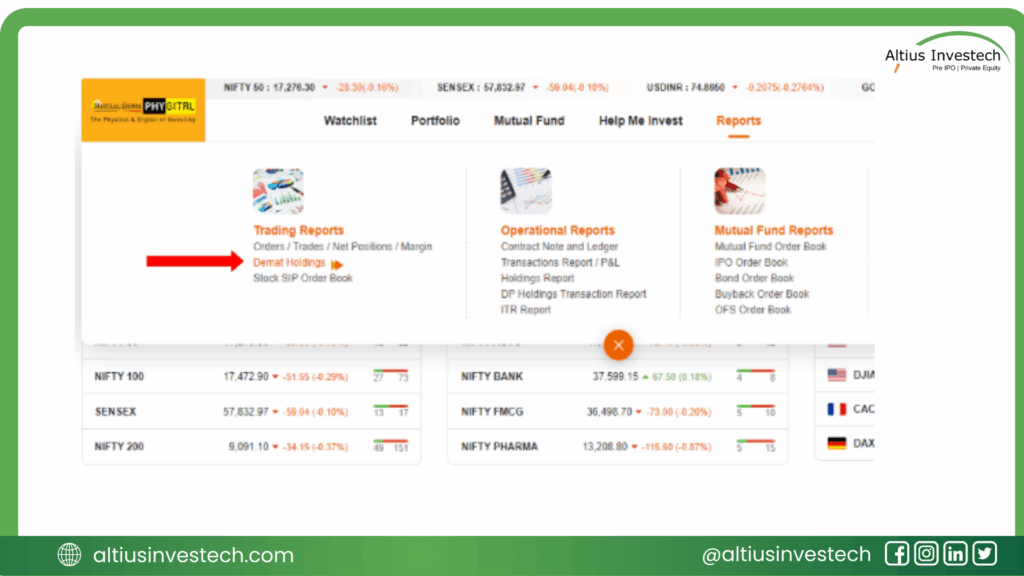 • A dropdown menu will appear under Reports. Select ‘Demat Holdings’.