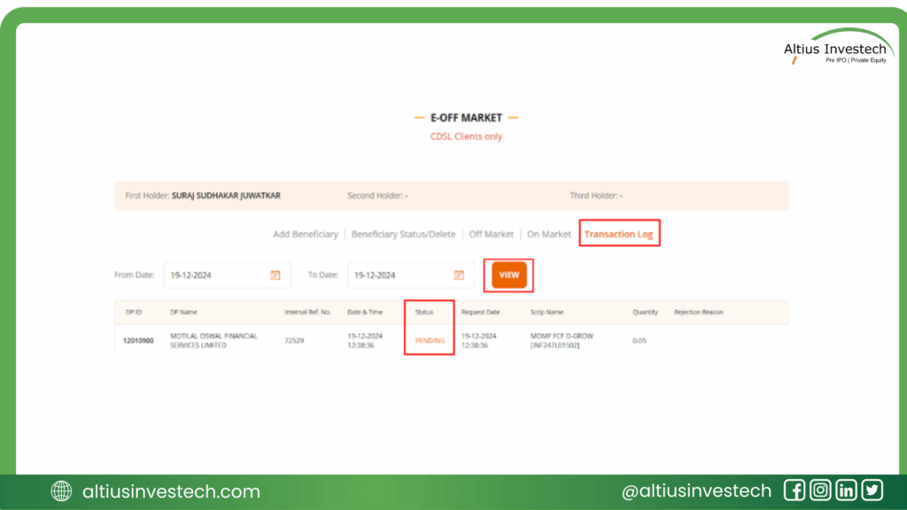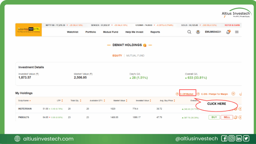 • On the Demat Holdings page, you will see your portfolio. Look for the ‘E-Off Market’ option (usually near the top right of the holdings list) and click it.