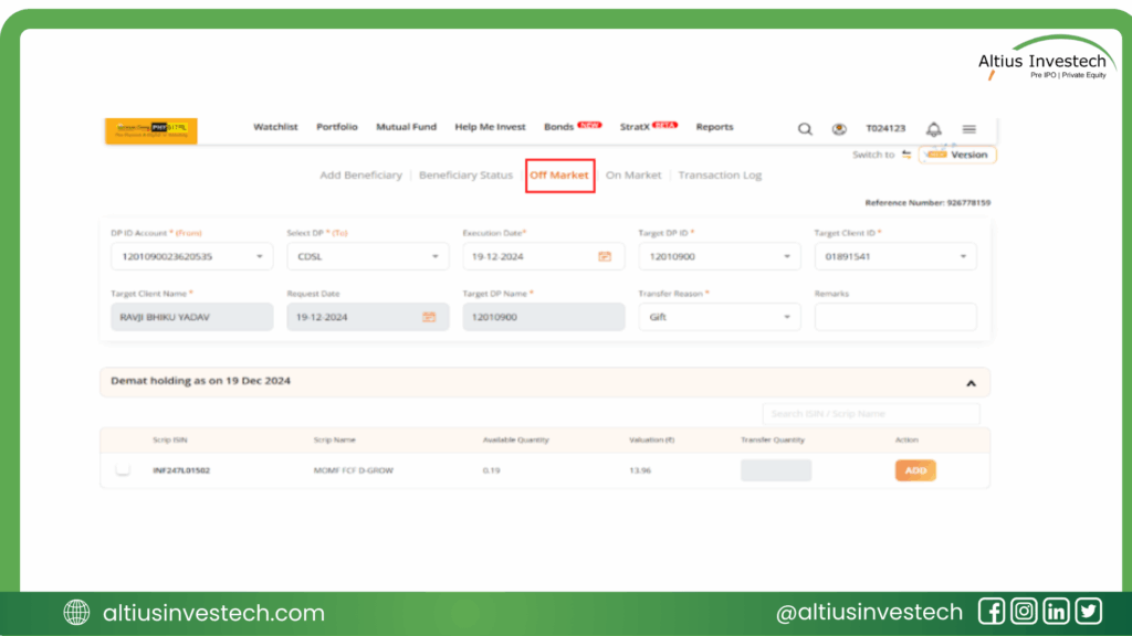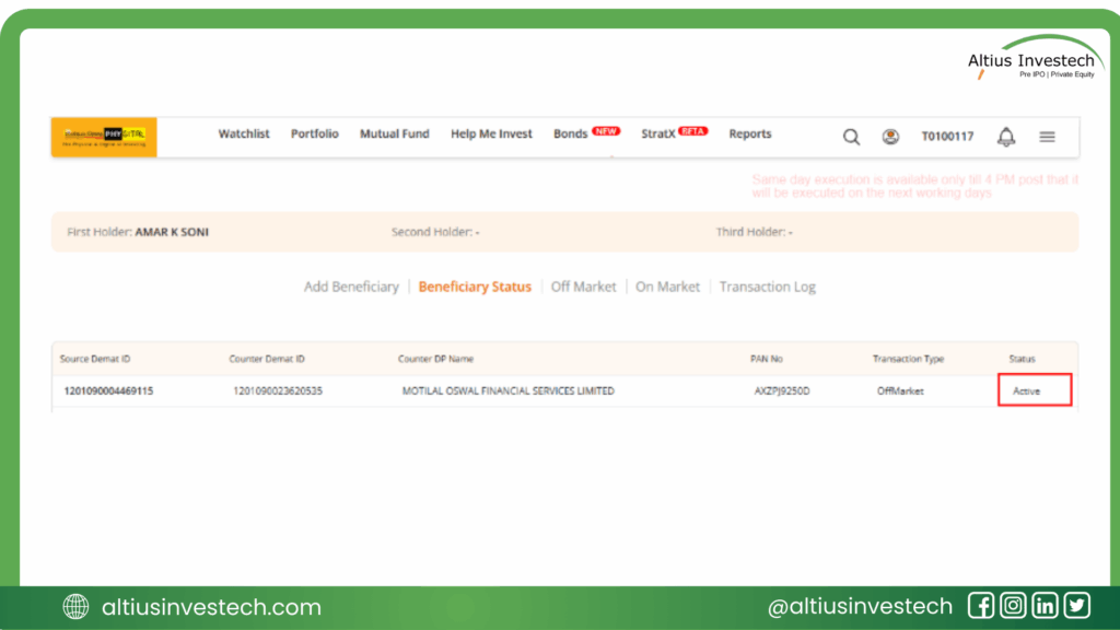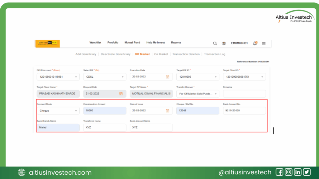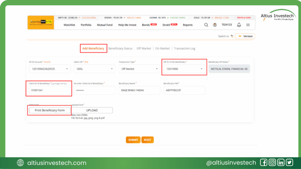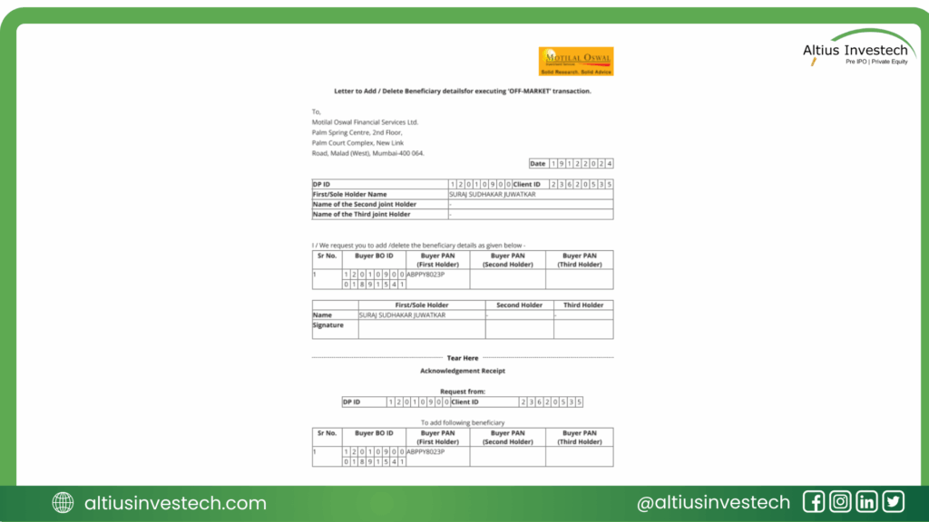 • Beneficiary DP Name: Enter the name of the Depository Participant (e.g., Motilal Oswal, Zerodha, etc.).