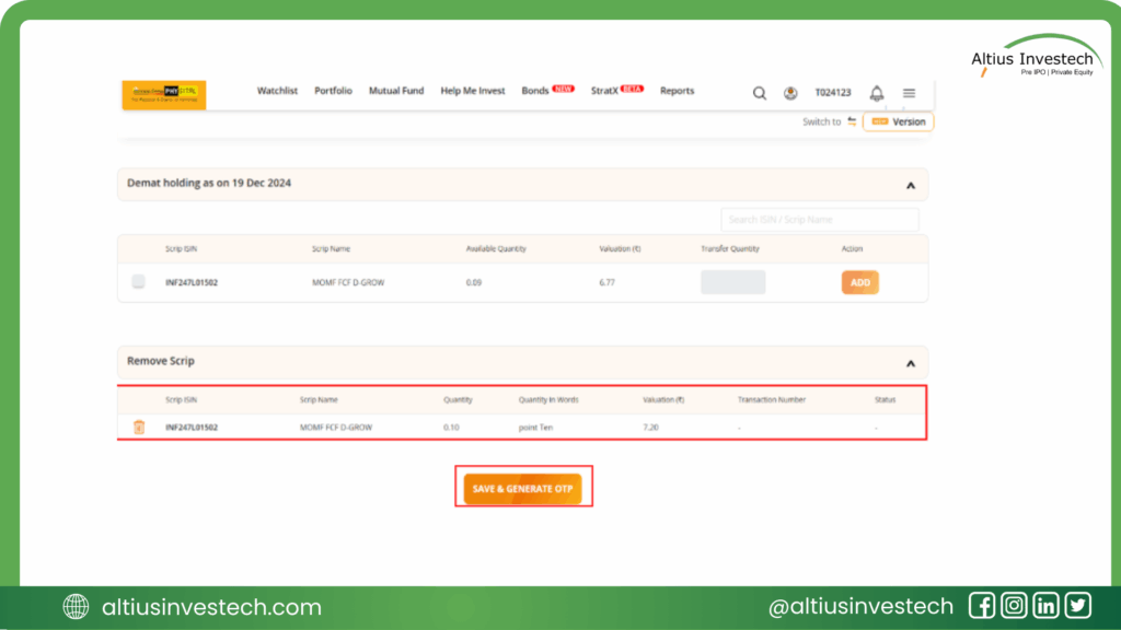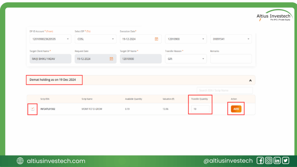 • Your current holdings will be displayed at the bottom. Select the scrip you want to transfer.