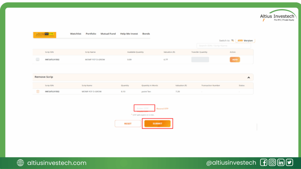 • Enter the OTP sent to your registered mobile/email (valid for 5 minutes) and click SUBMIT.