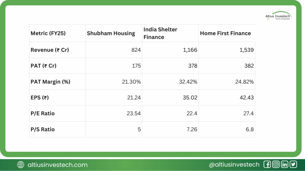 To understand Shubham’s value, we compare it to listed peers in the affordable housing space with similar revenue scale, such as India Shelter Finance and Home First Finance.