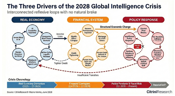 Imagine waking up in June 2028. Unemployment is at 10.2%. The stock market has already crashed 38% from its highs. Your neighbour, a senior software engineer, is now delivering your groceries. Your friend who managed a $2M budget at Salesforce is driving Uber. And the news anchor is talking about the worst financial crisis since 2008.