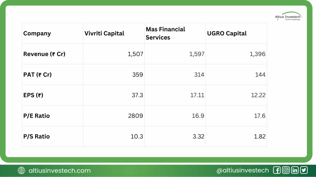 Vivriti’s revenue and profitability (PAT) are significantly stronger than its closest listed peers. Its PAT of ₹359 Cr (even with the associate loss) is well ahead of Mas Financial (₹314 Cr) and UGRO (₹144 Cr). This suggests that if and when Vivriti lists, it could command a premium valuation over its peers, if investors are convinced by the restructuring story and can look past the asset quality risks.