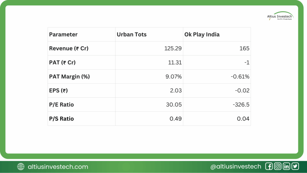 - A Tale of Two Toy Companies: While both companies are in the “Made in India” toy space, their financial health is completely opposite. Urban Tots is a high-growth, solidly profitable company with a 9.07% net profit margin. Ok Play, despite having higher revenue, is loss-making.